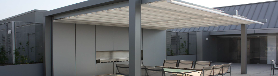 Пергольные беседки повышенной ветроустойчивости (по сравнению с маркизами) больших размеров. Ткань с крыши плавно переходит на стеновые направляющие, что позволяет сделать полное закрытие.